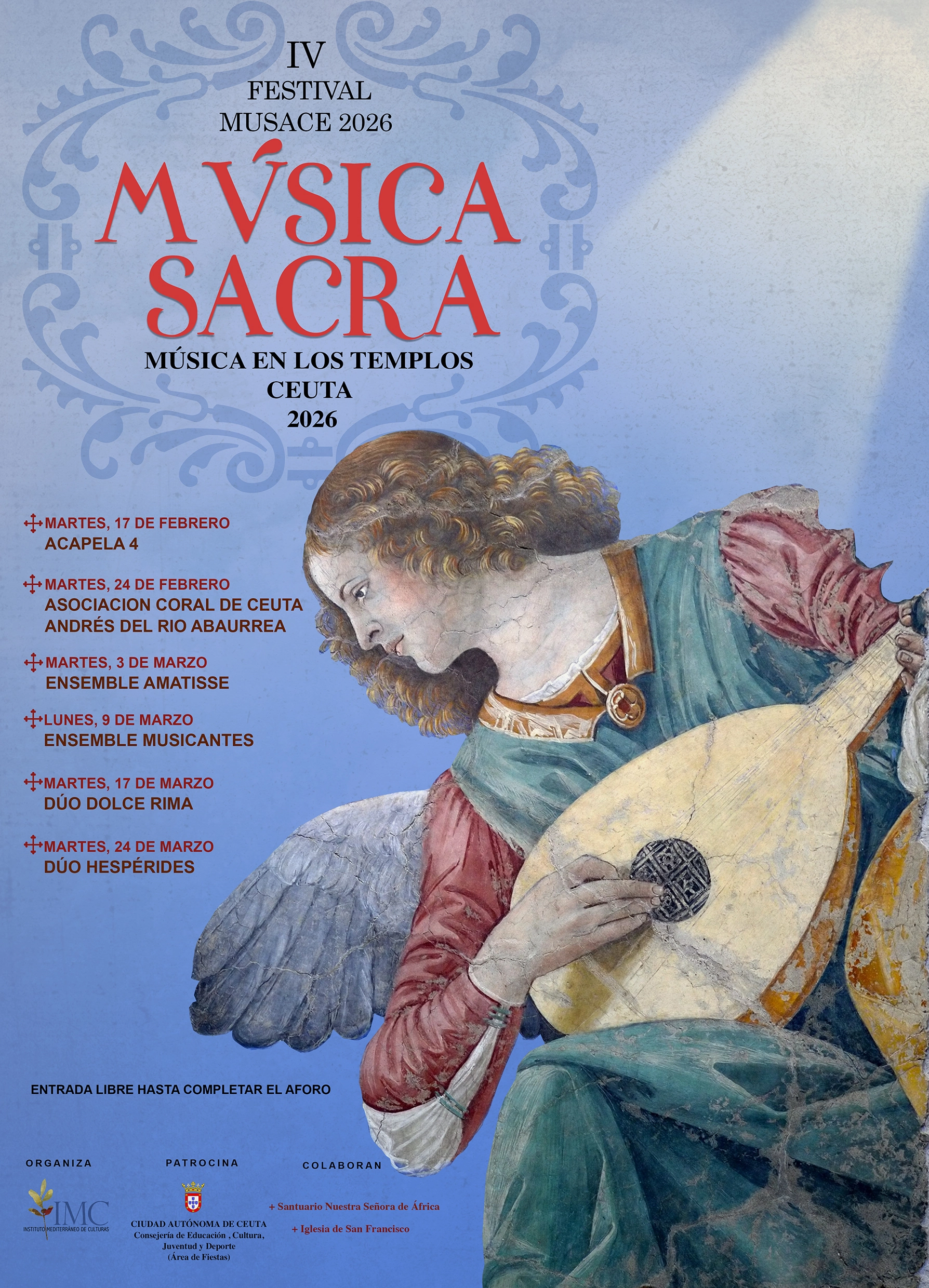 El programa del Festival de Música Sacra de Ceuta 2026 está compuesto por seis conciertos, repartidos entre los meses de febrero y marzo. Todas las actuaciones tendrán lugar a la misma hora (20:30 h) y la entrada gratuita hasta completar aforo para todos los conciertos.